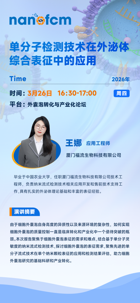 福流生物,应用科学家–王娜,将在3月26日16:30与大家分享:单分子检测技术在外泌体综合表征中的应用。